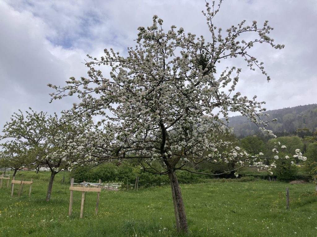 Le verger, planté en 2005, a été densifié en 2023 pour faire face aux vents plus forts et aux effets du réchauffement climatique. Les arbres — pommiers, poiriers, figuiers, mais aussi bouleaux, frênes, aubépines — poussent désormais en synergie, formant une trame protectrice pour les cultures. Pour soutenir les auxiliaires, nous avons installé des nichoirs et des perchoirs à rapaces, favorisant ainsi un équilibre naturel au sein du verger.
