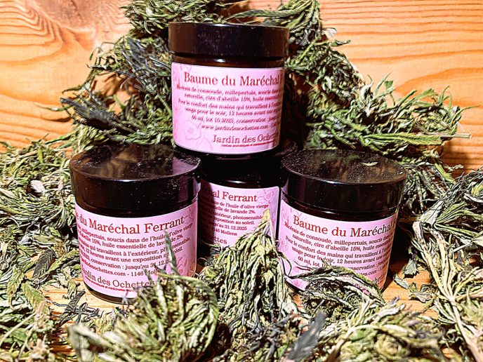 Depuis des années le baume du Maréchal Ferrant nous accompagne tout au long de nos travaux et loisirs d’extérieurs. Protection des mains , il est efficace contre les crevasses, petites lésions de la peau, assouplissement des articulations, brûlures légères.