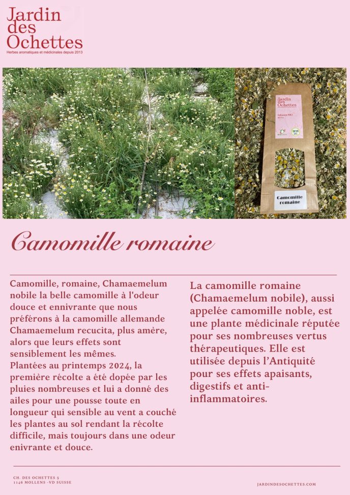 Camomille, romaine, Chamaemelum nobile la belle camomille à l’odeur douce et ennivrante que nous préférons à la camomille allemande Chamaemelum recucita, plus amère, alors que leurs effets sont sensiblement les mêmes.